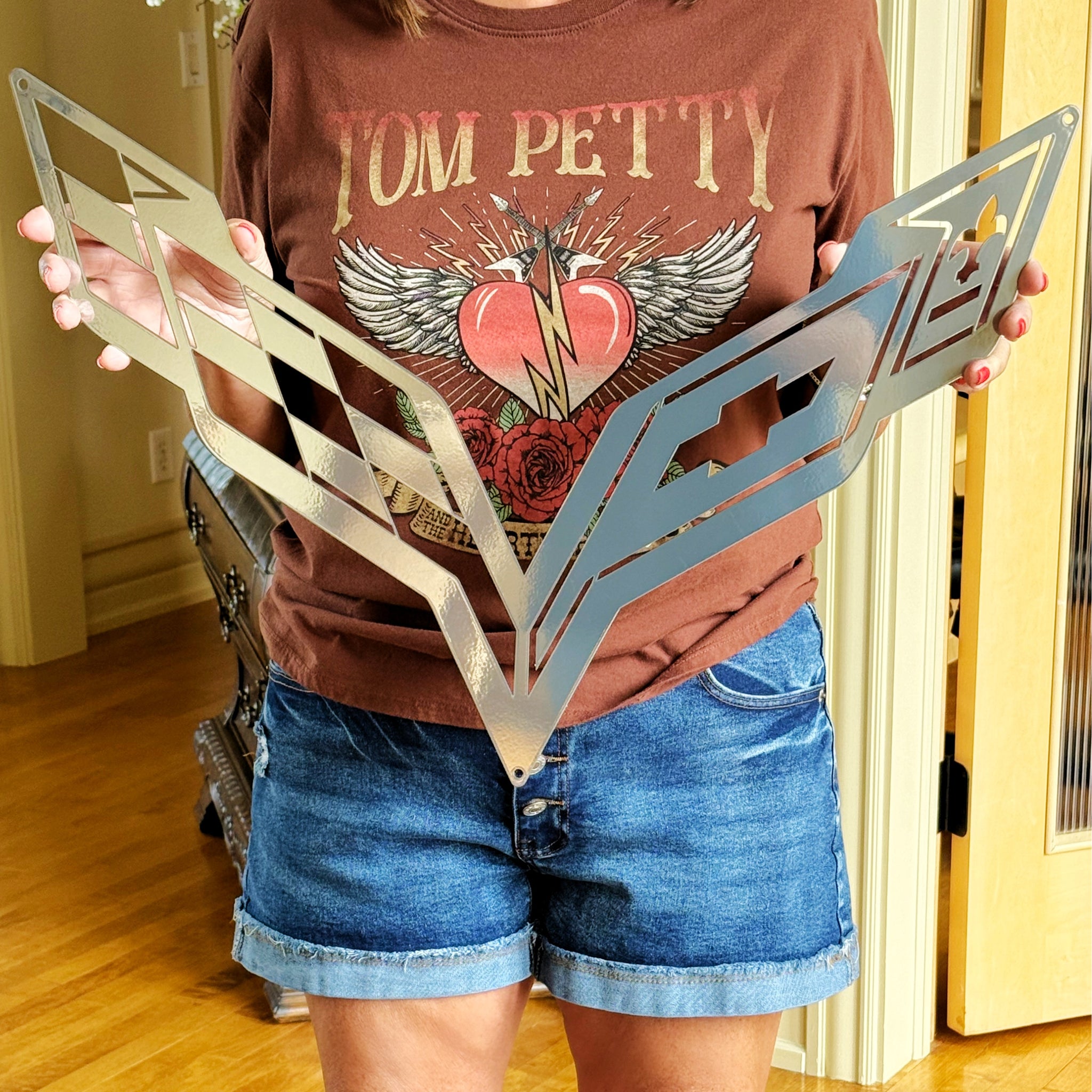 This C7 Cross-Flag emblem is Laser Cut from flat 14 gauge steel sheet and finished in PChrome. The result is a high quality emblem that is a full 24" by 15" in size. This is not a cheap vinyl overlay that will weather quickly outside but a nearly indestructible Corvette piece of art that will wear just as good outside as inside. The back side is also protected with a PChrome coating for complete weather protection.
